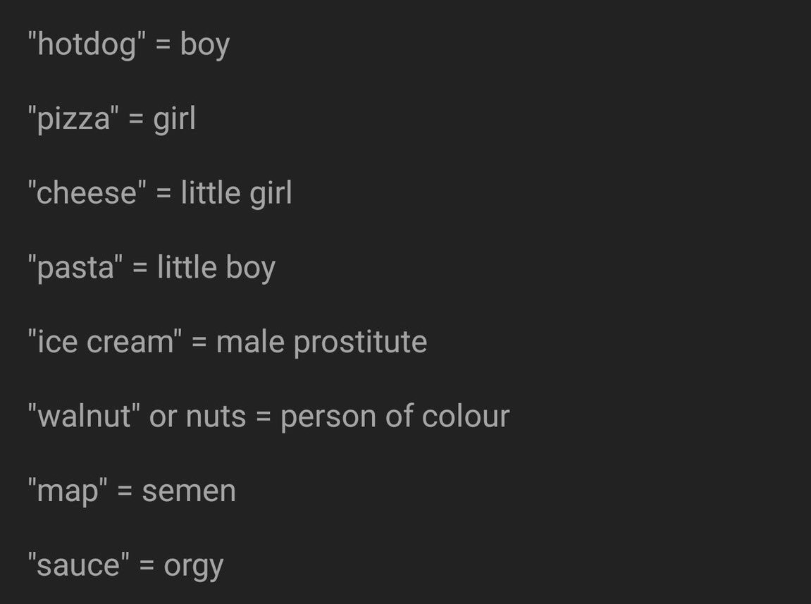 I hung out on 4Chan before Wikileaks Podesta. I can confirm the Lolita, pizza, sauce memes are longstanding there. The instagrams of JimmyCommet many more on 8Ch also speak for themselves. I suspect only shills or cognitive dissonance impaired folk can't see what ping pong means. I have have a pic of a pizza related map from 8Chan. Unfortunately it's real. Playing dominos on cheese vs pasta, or got a box of assorted cheeses instead of pasta, or I don't care if it's pasta or cheese as long as it doesn't have hair. Unfortunately it's true. God never promised heaven on earth. Satan is running amuck.