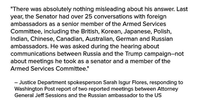 The only way you can make this a "thing" is if you purposefully take what he said during his confirmation hearing out of context. He was asked by Franken if he was aware of any meetings between trump campaign and russian officials during the campaign or if he met with them acting as a surrogate for the campaign. He wasn't and he hadnt. That's the truth. It's his job to meet with them as a member of the committee. He didn't meet with them on behalf of the campaign and the campaign had nothing to do with it. Other senators would've known very well it's his job to meet with foreign officials while on the committee, and it'd be irrelevant to the question asked.